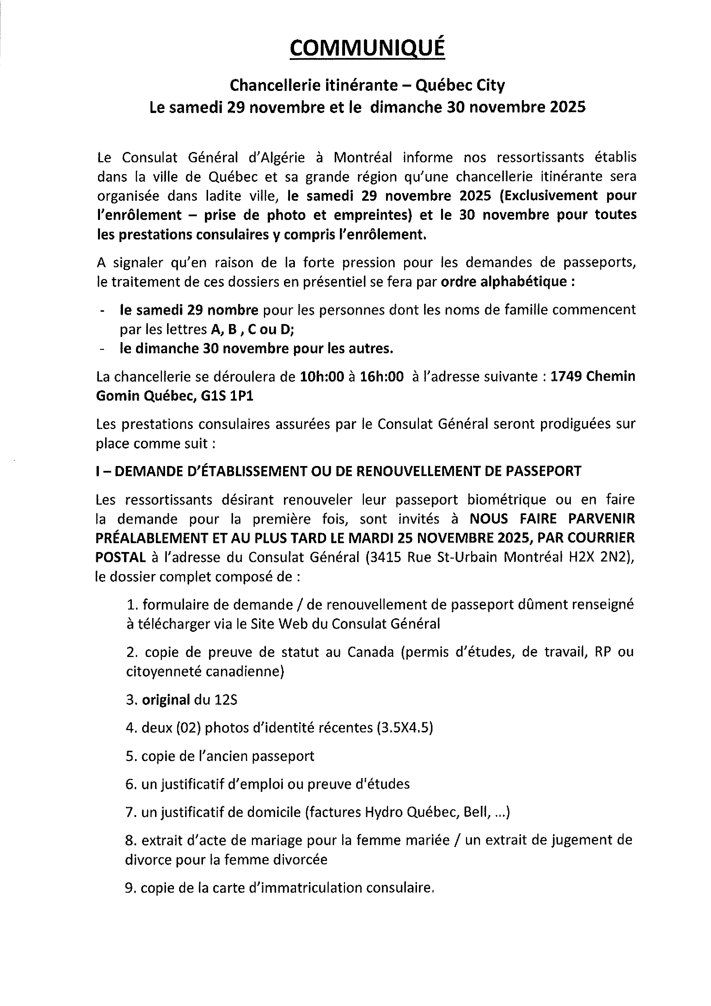 Le Consulat Général d'Algérie à Montréal, porte à la connaissance des ressortissants établis dans sa circonscription consulaire que le ministre des Moudjahidine et des Ayants-droit a émis un avis d'ouverture d'un concours national pour la conception du Logo du 70ème anniversaire du déclenchement de notre glorieuse révolution. Les ressortissants souhaitant participer à ce concours sont priés de prendre connaissance des détails dudit concours en cliquant sur le lien suivant :