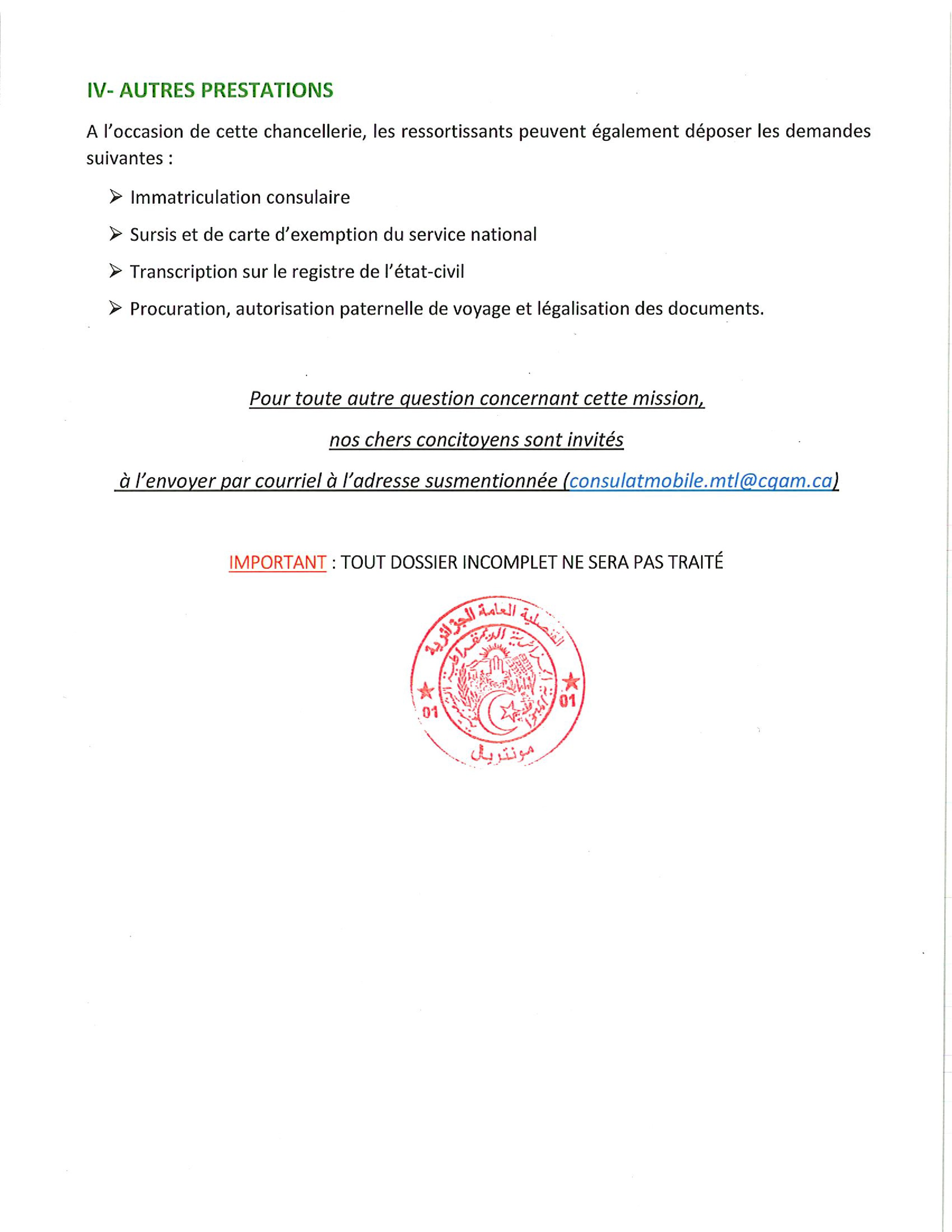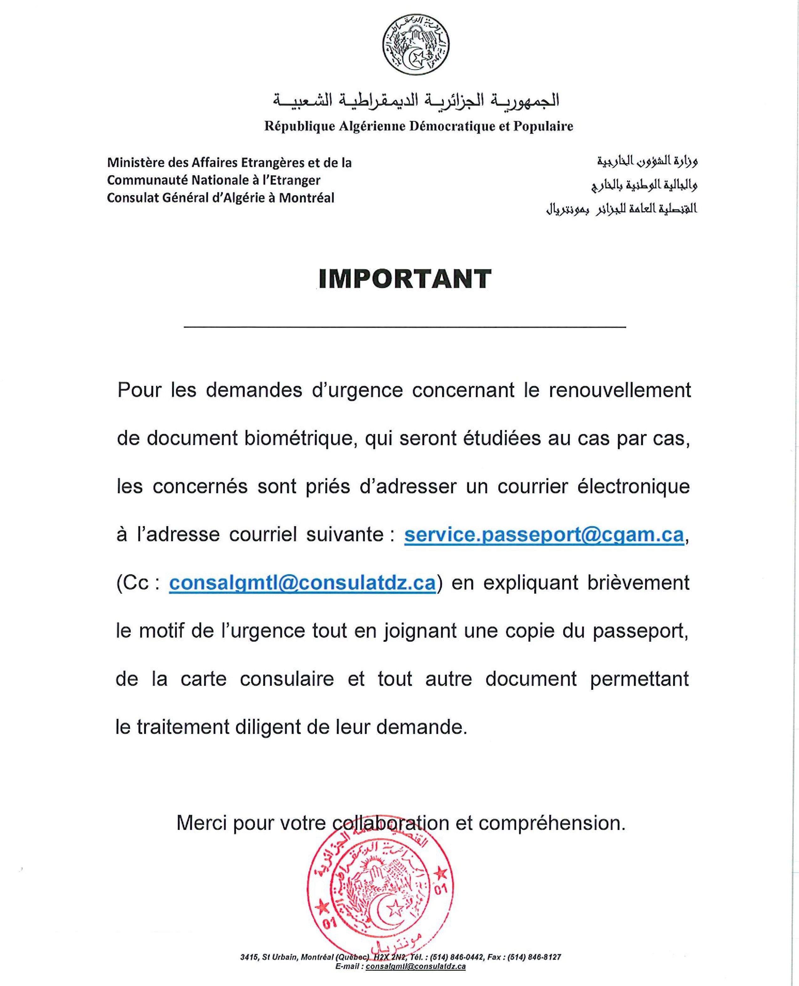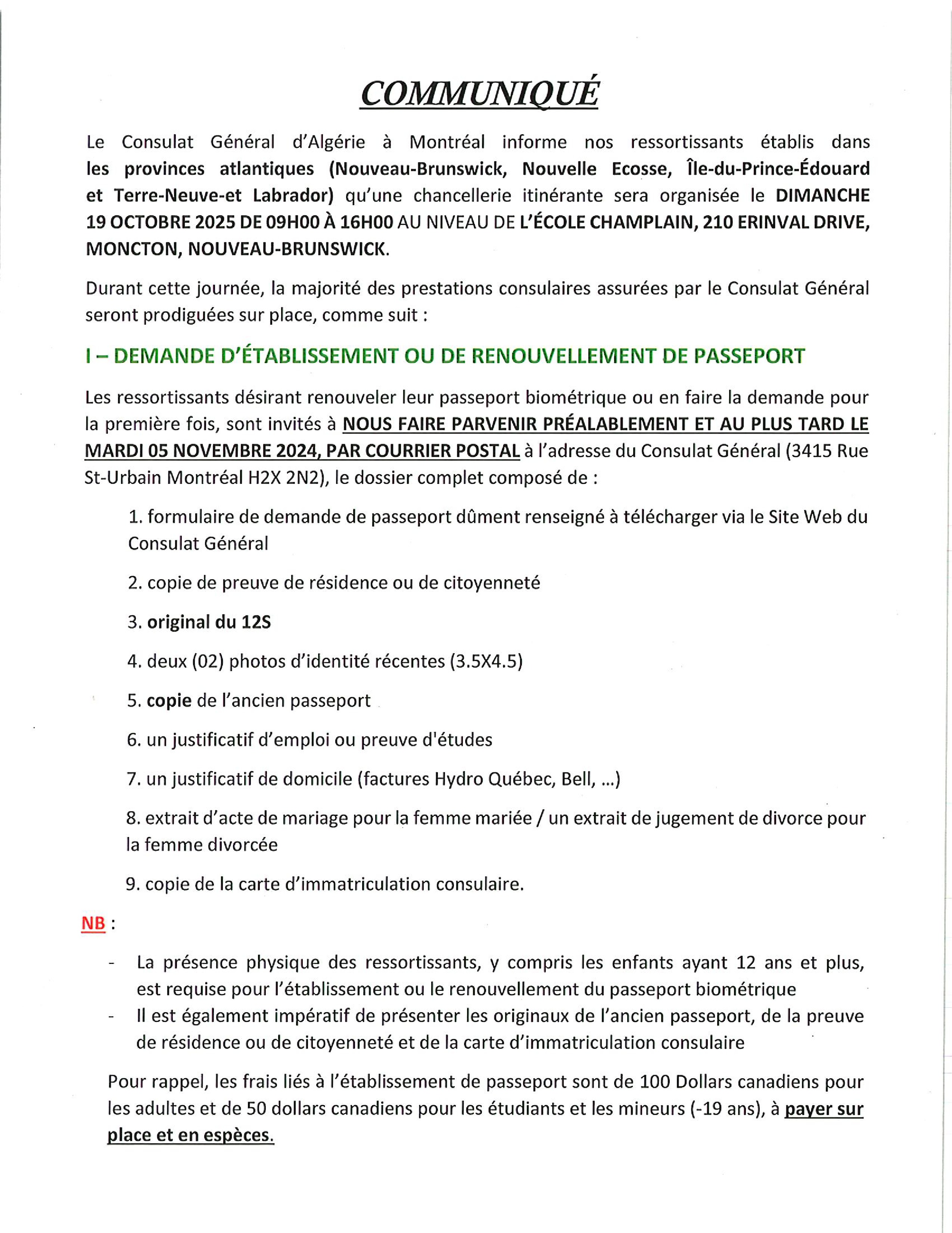 Le Consulat Général d'Algérie à Montréal, porte à la connaissance des ressortissants établis dans sa circonscription consulaire que le ministre des Moudjahidine et des Ayants-droit a émis un avis d'ouverture d'un concours national pour la conception du Logo du 70ème anniversaire du déclenchement de notre glorieuse révolution. Les ressortissants souhaitant participer à ce concours sont priés de prendre connaissance des détails dudit concours en cliquant sur le lien suivant :