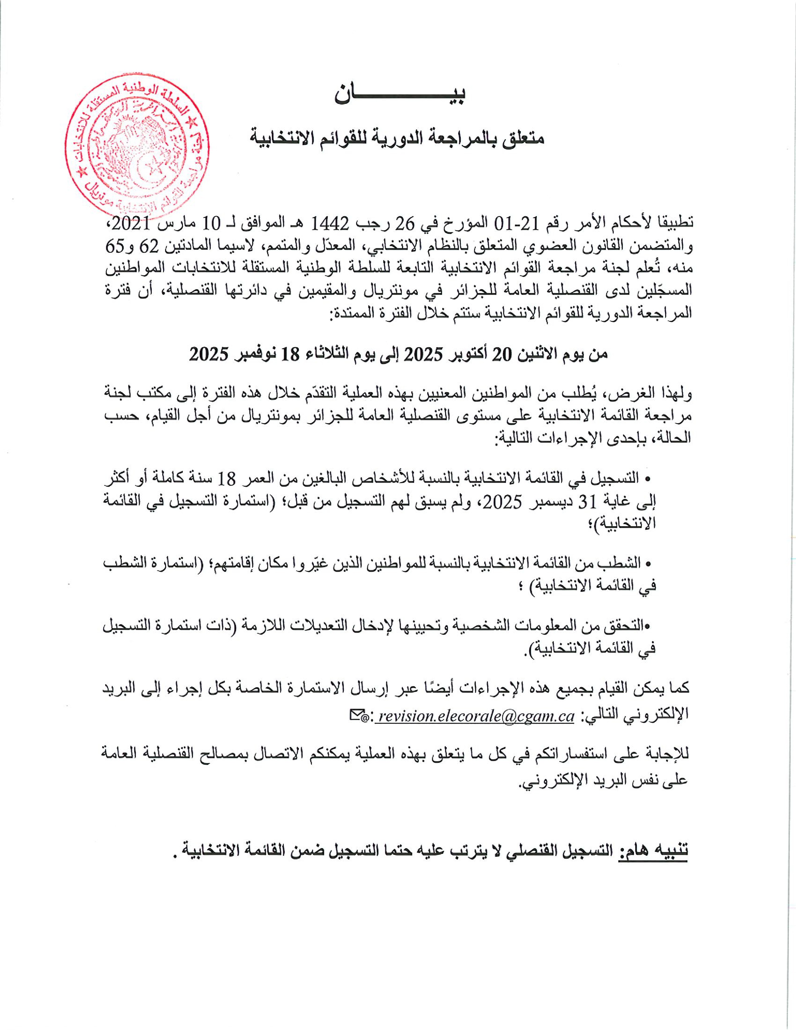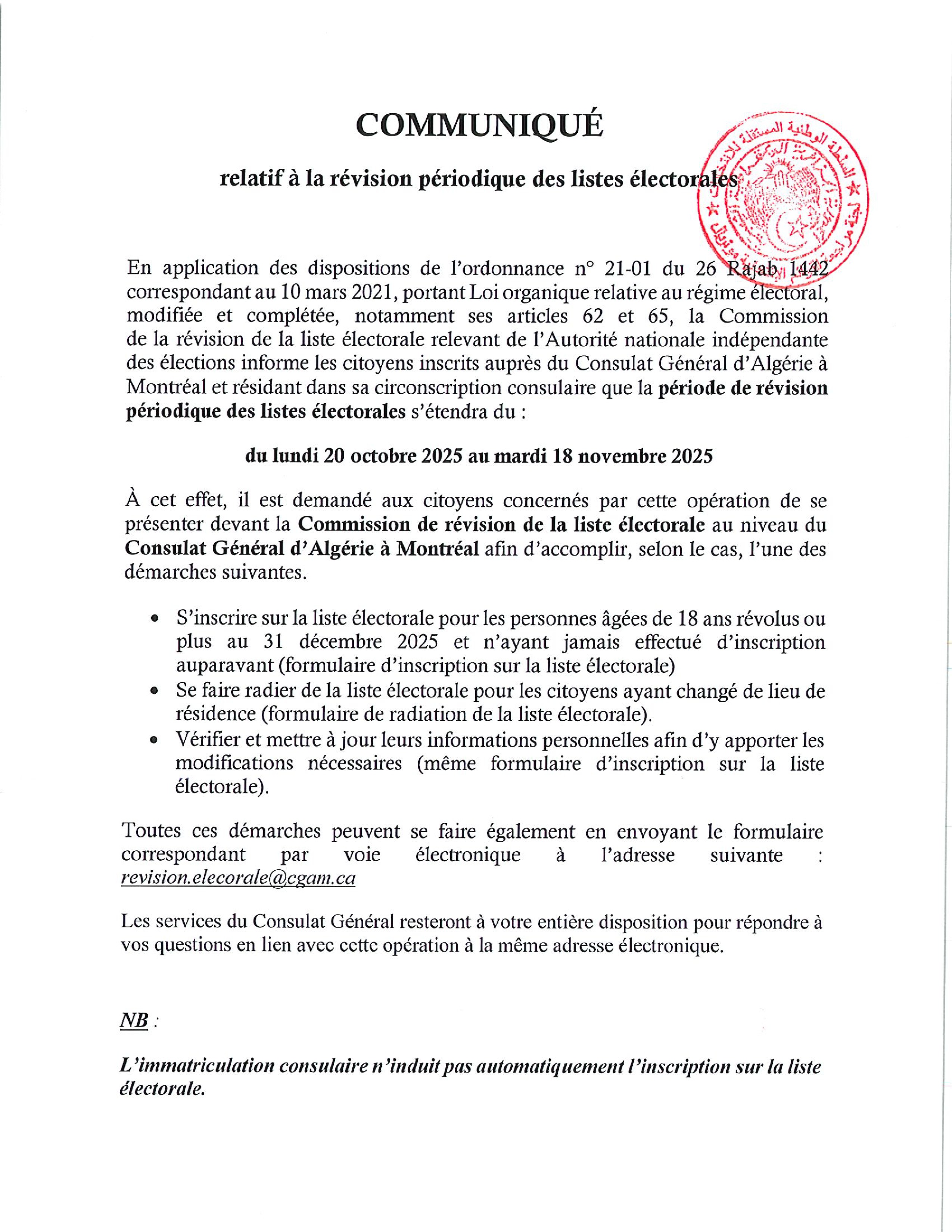 Le Consulat Général d'Algérie à Montréal, porte à la connaissance des ressortissants établis dans sa circonscription consulaire que le ministre des Moudjahidine et des Ayants-droit a émis un avis d'ouverture d'un concours national pour la conception du Logo du 70ème anniversaire du déclenchement de notre glorieuse révolution. Les ressortissants souhaitant participer à ce concours sont priés de prendre connaissance des détails dudit concours en cliquant sur le lien suivant :