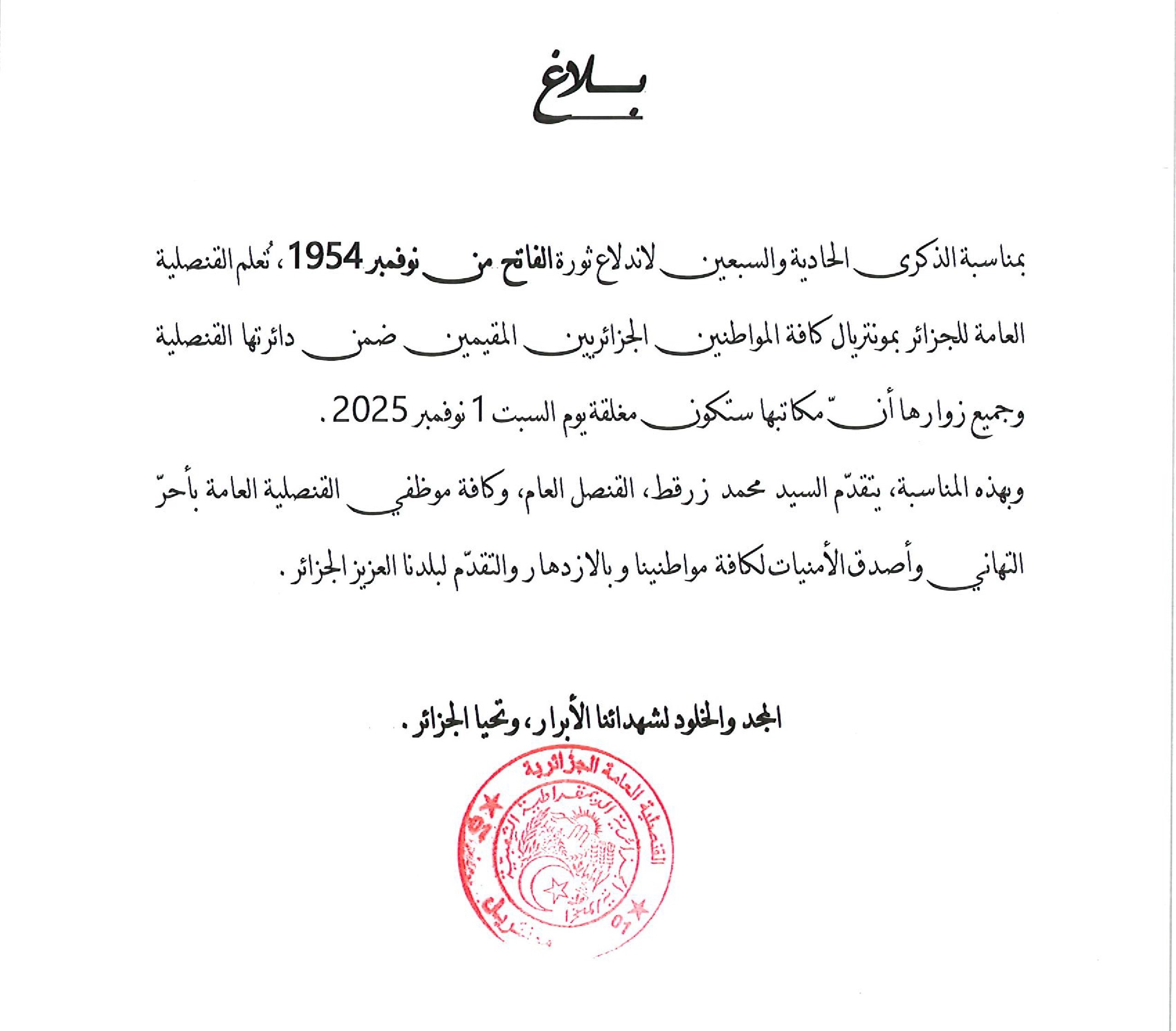 Le Consulat Général d'Algérie à Montréal, porte à la connaissance des ressortissants établis dans sa circonscription consulaire que le ministre des Moudjahidine et des Ayants-droit a émis un avis d'ouverture d'un concours national pour la conception du Logo du 70ème anniversaire du déclenchement de notre glorieuse révolution. Les ressortissants souhaitant participer à ce concours sont priés de prendre connaissance des détails dudit concours en cliquant sur le lien suivant :