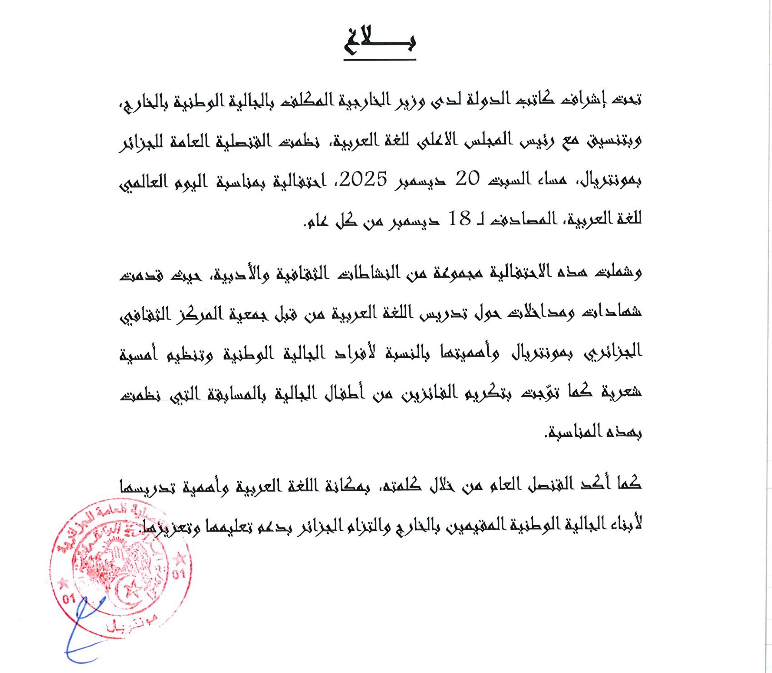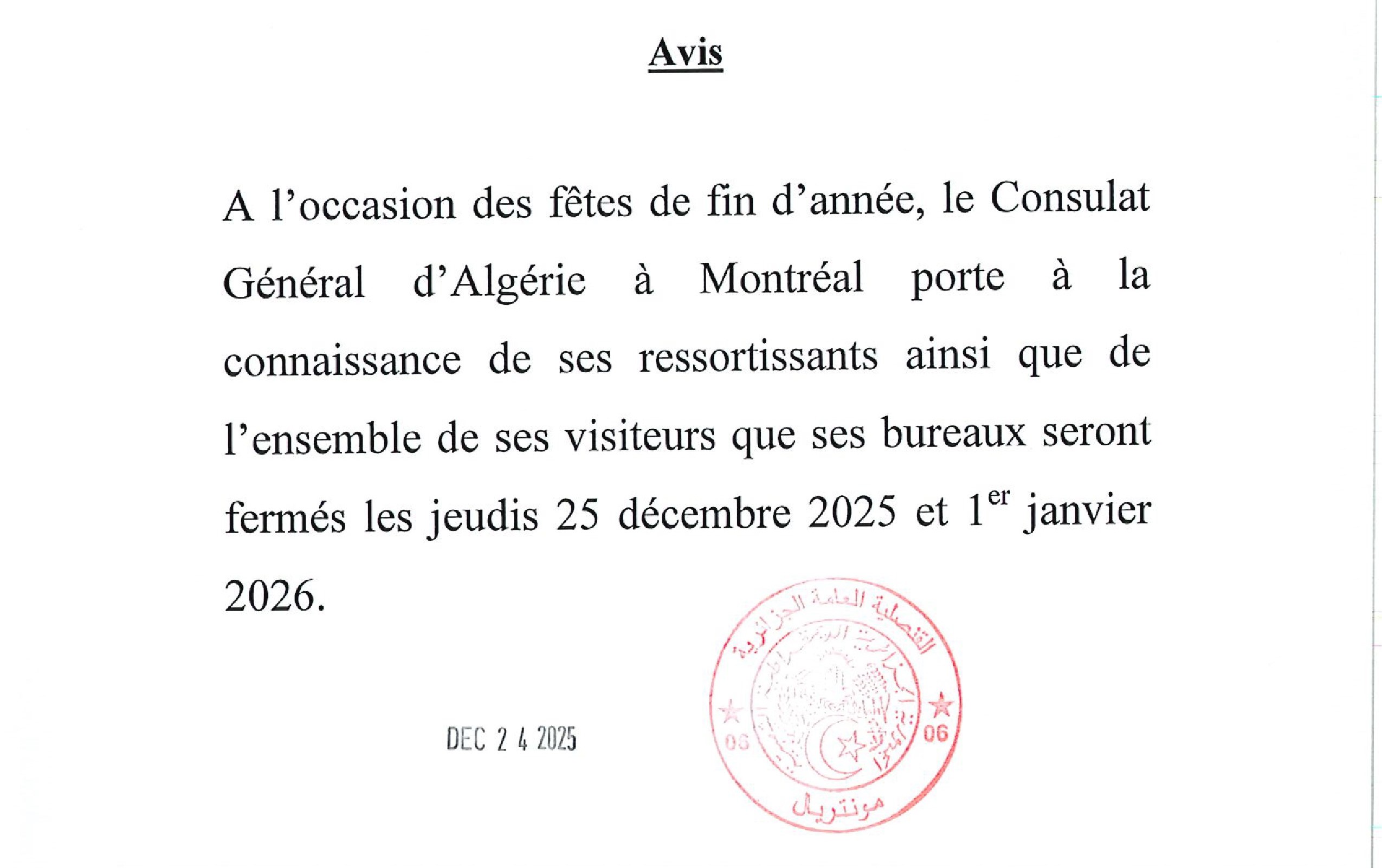 Le Consulat Général d'Algérie à Montréal, porte à la connaissance des ressortissants établis dans sa circonscription consulaire que le ministre des Moudjahidine et des Ayants-droit a émis un avis d'ouverture d'un concours national pour la conception du Logo du 70ème anniversaire du déclenchement de notre glorieuse révolution. Les ressortissants souhaitant participer à ce concours sont priés de prendre connaissance des détails dudit concours en cliquant sur le lien suivant :